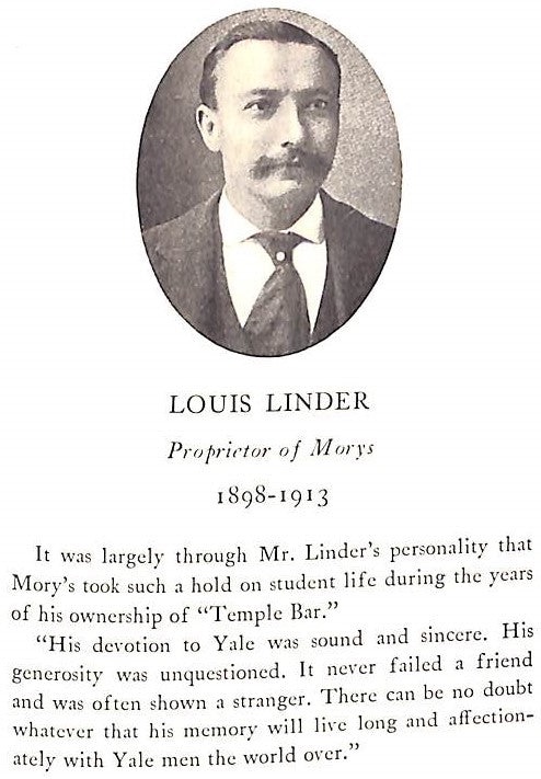 Five boys from the Yale Glee Club would meet at Mory’s Temple Bar (where Louis tended the bar), to sing unrestricted from the conventions of the Glee Club. The group is comprised of 14 male students and has been in existence since 1909. During the school year they sing every Monday night at Mory’s.